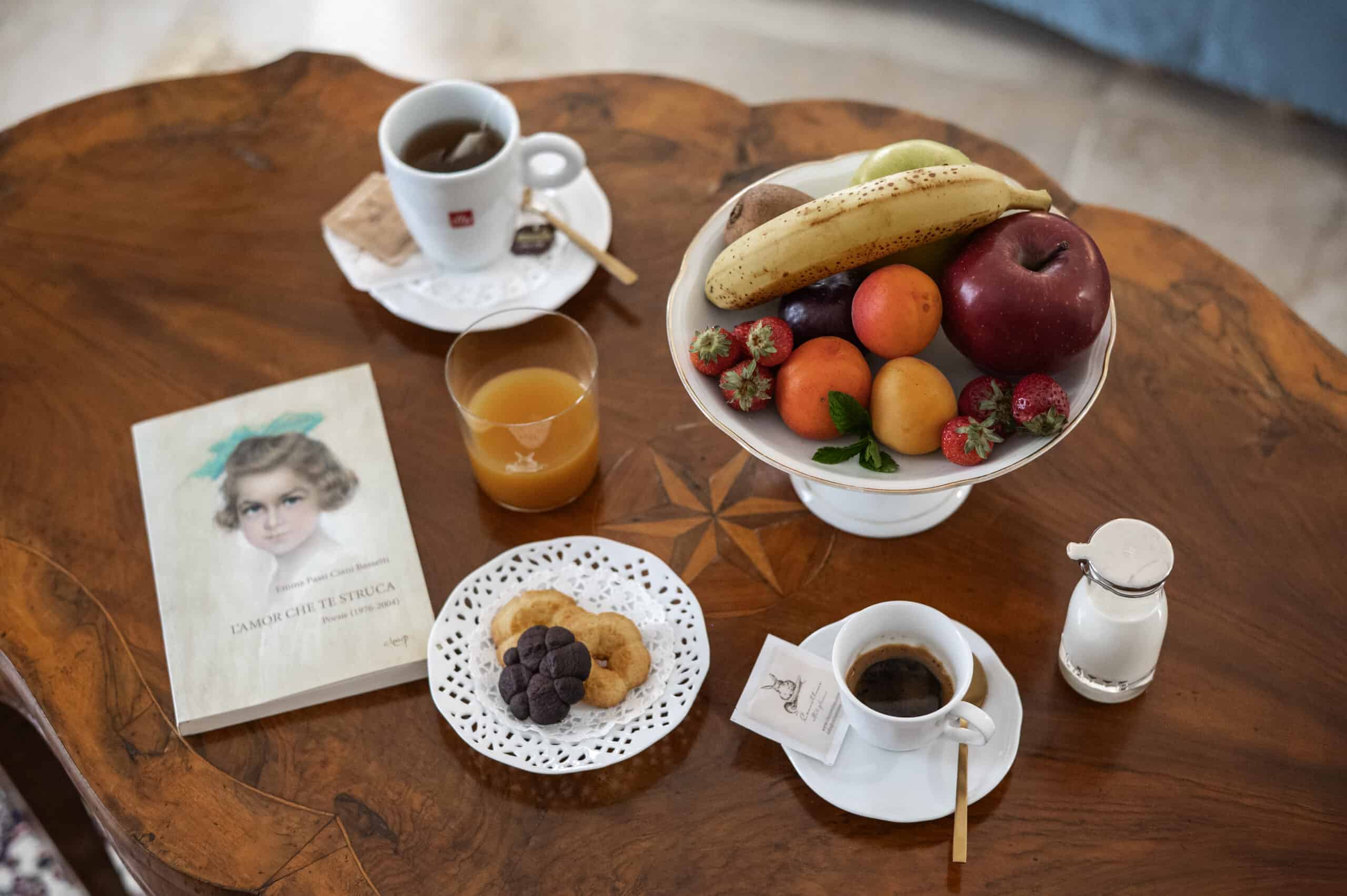 In ogni camera trovi tutto l’occorrente per una colazione indipendente e curata con una scelta di tè e tisane, caffè Illy, piccola biscotteria fatta in casa, succhi di frutta a acqua.